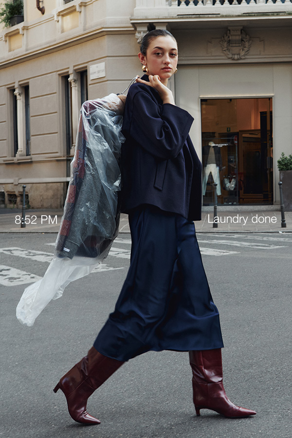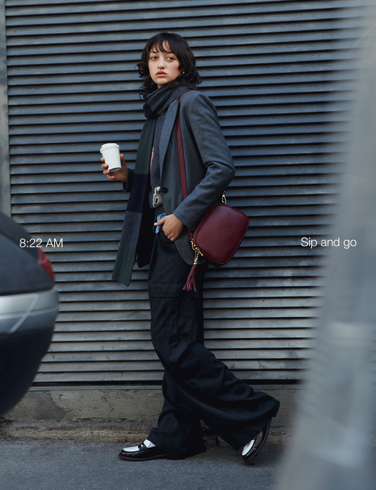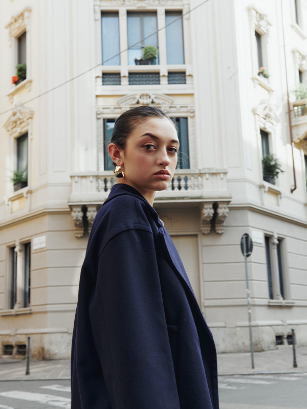 Complete the outfit with a classic navy or micro-check peacoat. Loafers are updated in contrasting black and white: where elegance blends tradition and trend.