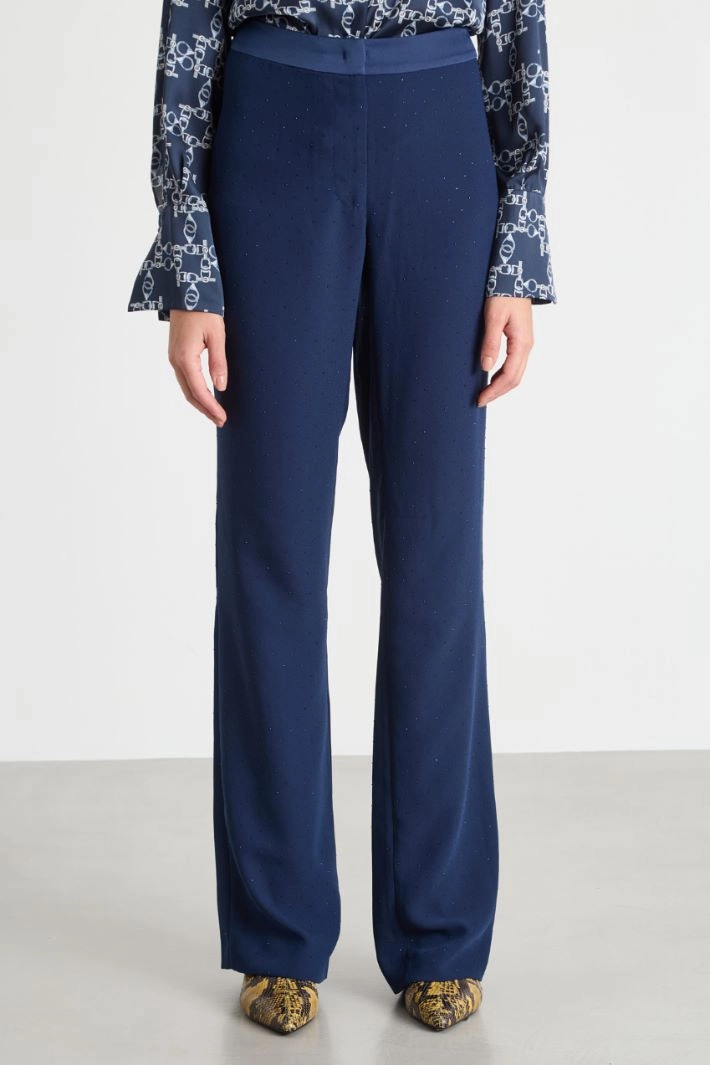 Trousers in matte envers satin with a soft, flared silhouette, embellished all over with micro-rhinestones and defined by a lustrous satin waistband. Concealed hook and zip fastening.