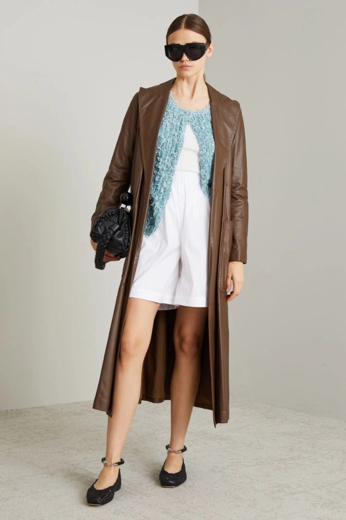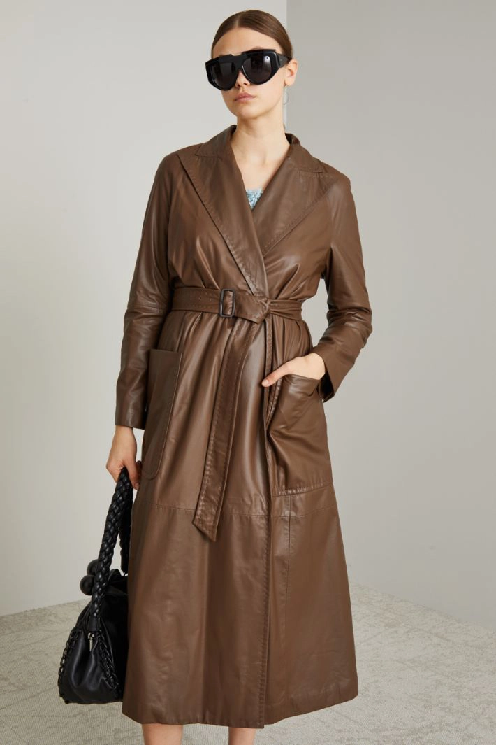 Long, loose-fitting trench coat in genuine nappa leather with matching stitching, lapel collar, long raglan sleeves with buttons, side patch pockets and fastening with a matching belt with metal buckle. Lined.