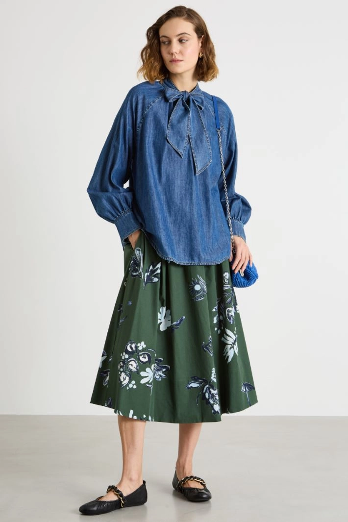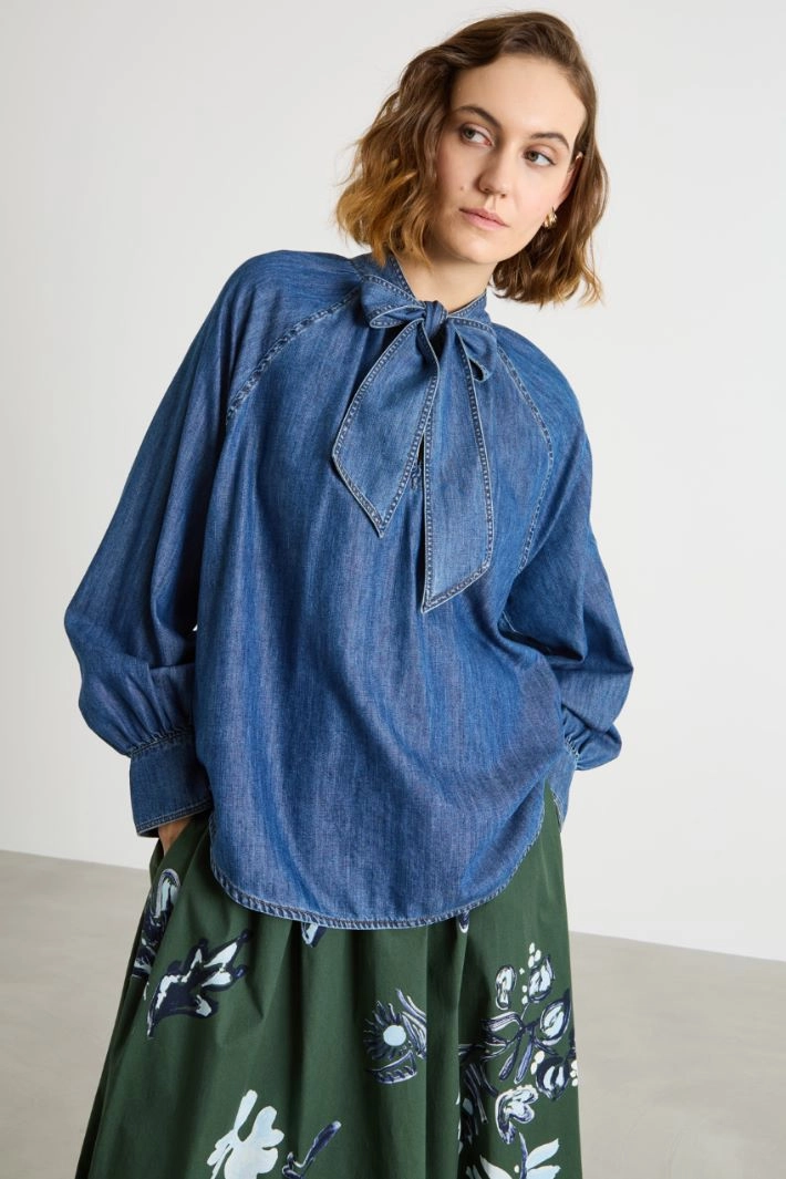 Denim blouse with self-tie scarf collar