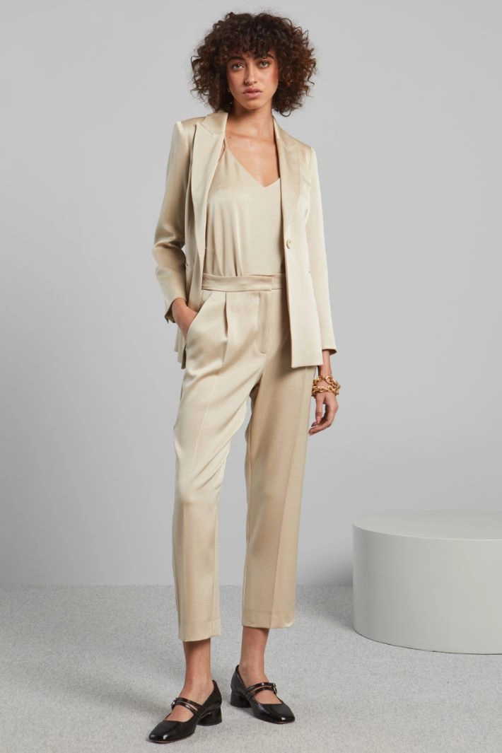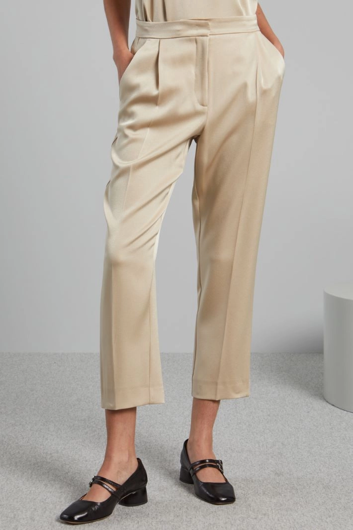 Satin carrot trousers with belt and pleats sewn at the waist, French pockets at the front and welt pockets at the back. Pressed crease. Hidden fastening with zip, button and hook.