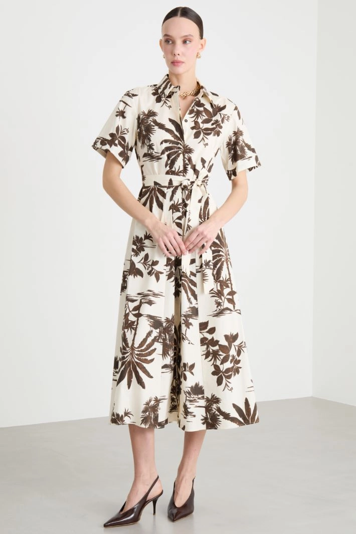 An A-line shirt dress cut from stretch cotton poplin with an all-over print, featuring a pointed collar, short sleeves with turn-up cuffs and in-seam pockets. Finished with a button fastening and a matching belt.
