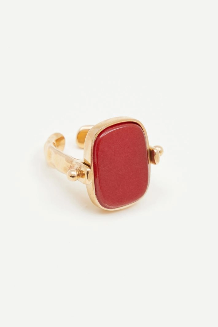 A metal ring with a hammered texture, featuring small spheres at the sides and a contrasting set stone.