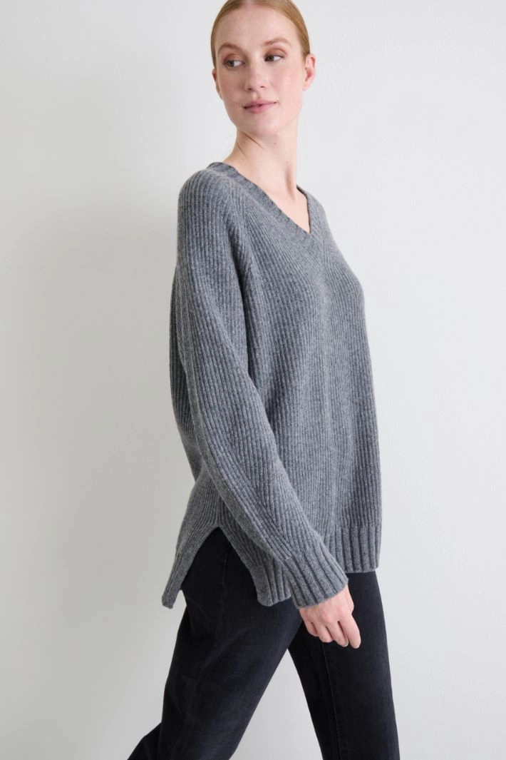 Loose-fit sweater in blend of wool, viscose and cashmere, with ribbed knit, V-neck and long raglan sleeves.