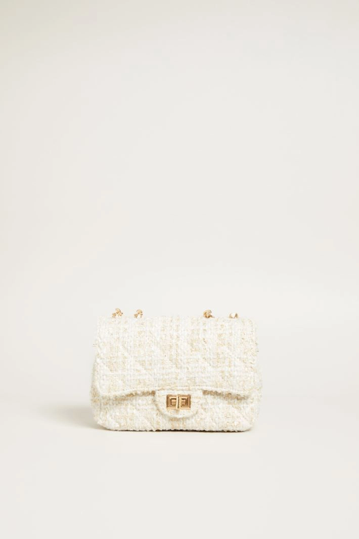 Tweed bag with lamé insert, chain shoulder strap, interior lined in faux leather with pocket and snap closure on the flap.