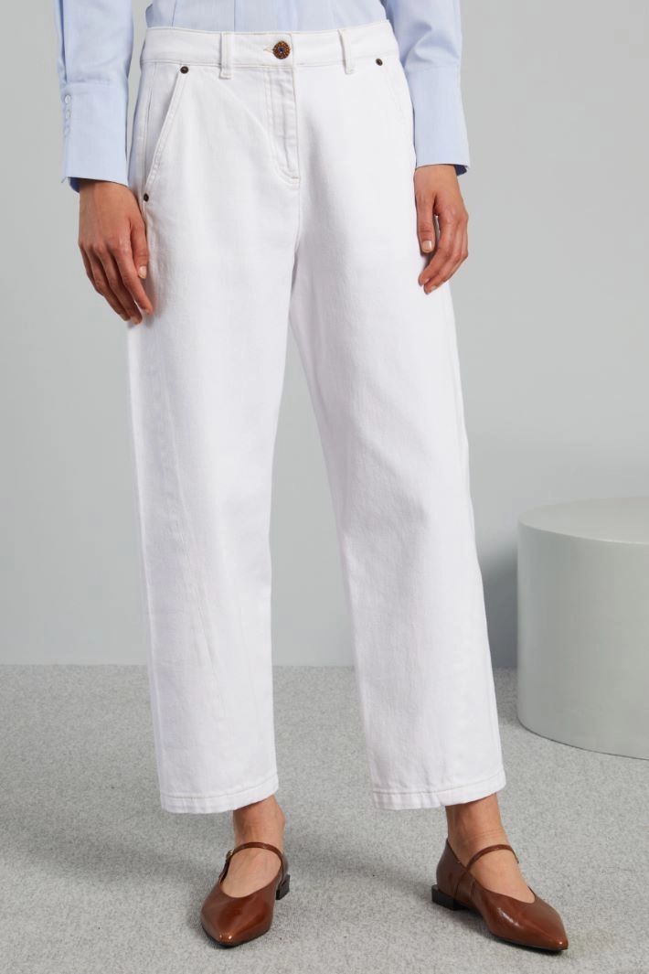 Baggy trousers in stretch cotton drill, with French pockets on the front and welt pockets on the back. Fastening with hidden zip and jewel button.