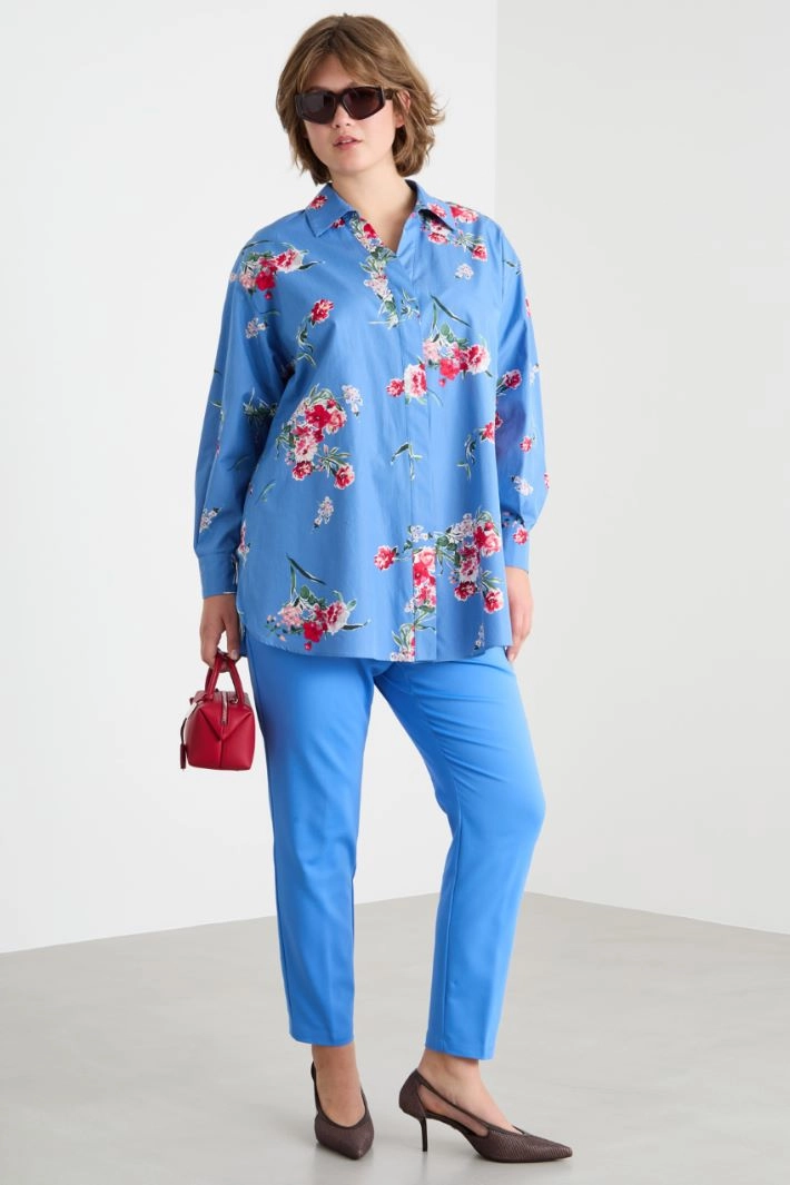 A-line tunic in printed pure cotton poplin, with a pointed collar and V-neckline, long sleeves with cuffs and buttons and a rounded hem with side slits. Button fastening.