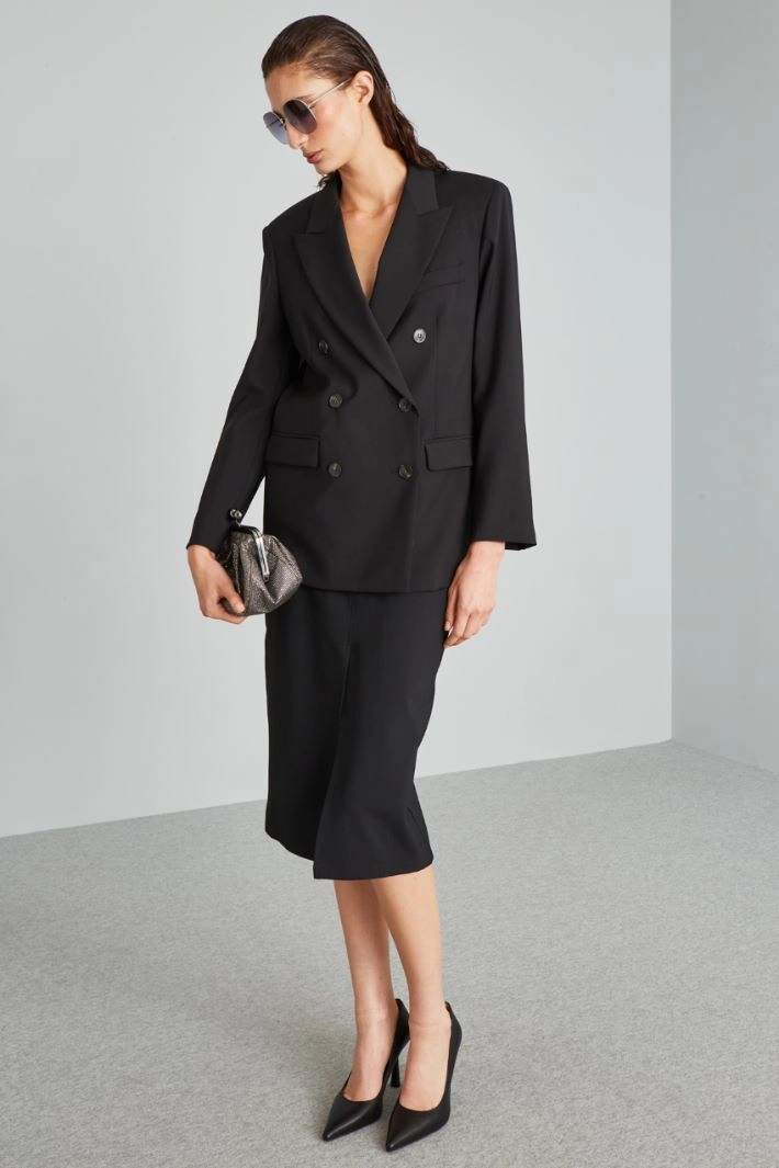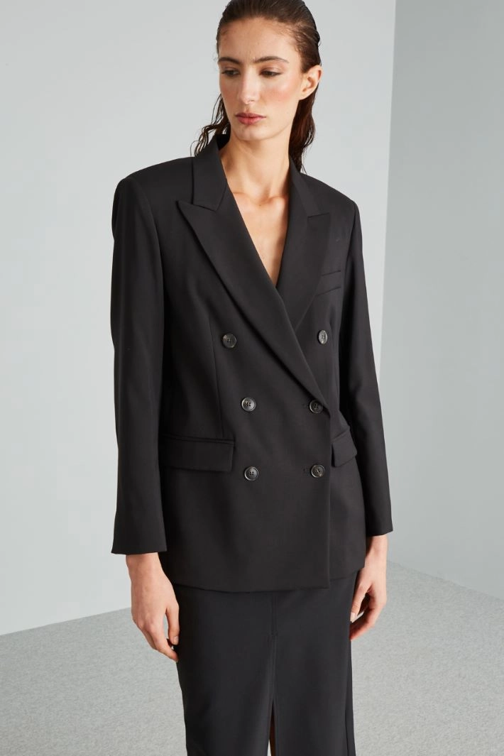 Straight-cut blazer in pure wool canvas, with lapel collar, long sleeves with buttons at the bottom, welt pocket, double welt pockets with flap, dot-finished profiles and vent in the back. Double-breasted button fastening. Lined.