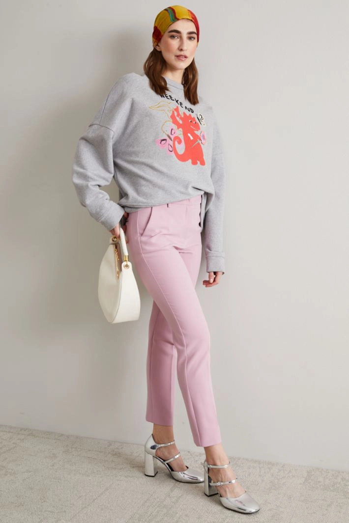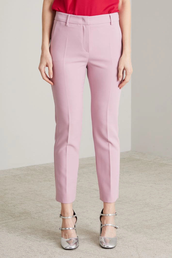 Cigarette trousers in stretch viscose canvas, with belt loops at the waist, side French pockets and double welt pockets with button on the back, hidden fastening with zip, button and hook.