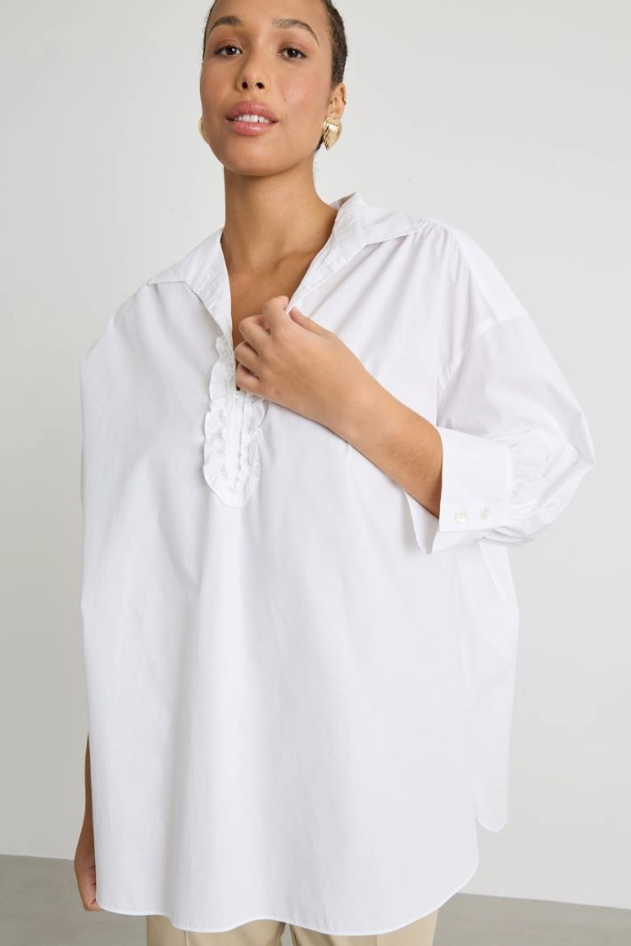 A-line blouse in cotton poplin, featuring a ruffle-trimmed pointed collar, gathered three-quarter-length sleeves and a rounded hem with side slits.