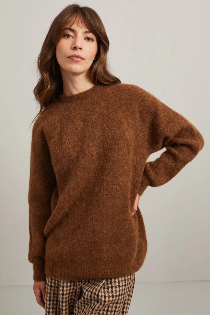 Straight-fit sweater in ribbed mohair and wool blend yarn, with round neckline and long raglan sleeves.